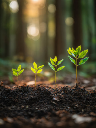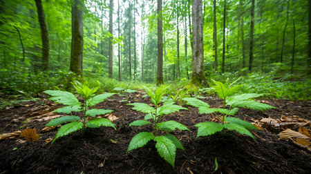 Young green saplings growing on forest floor with soft natural light and blurred background creating peaceful mood