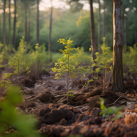 A lush forest clearing with freshly planted saplings surrounded by older trees, showcasing the progress of reforestation in a natural environment