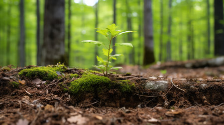 A young sapling rises from a moss-covered stump in a tranquil forest, capturing the essence of new growth and the vibrant beauty of woodland ecosystems.