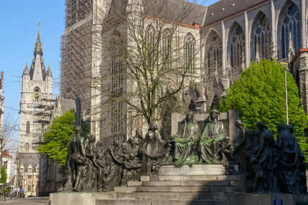 Ghent, Belgium; 04 28 2016. The Ghent's Cathedral and the Statue of the Van Eyck Brothers is a realistic group of figure statues. The belfry of Ghent, the old medieval tower at the background.