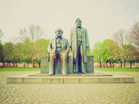 Vintage looking Marx and Engels statue in Marx-Engels-Forum, Alexanderplatz, Berlin