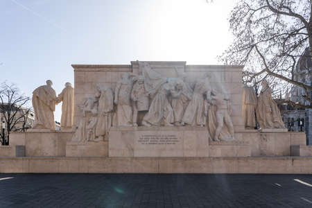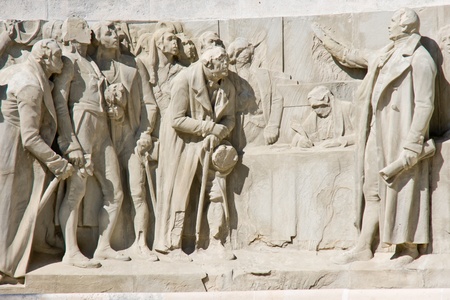 Bas relief of front side of Monument to Reformations on Bispetrov square in city center of Copenhagen city of Denmark. The council of noblemen agreed to the introduction of the reformation 30. october 1536