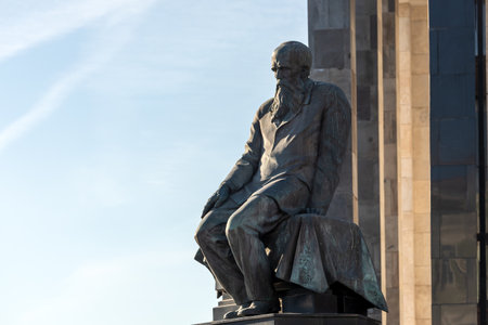 Moscow, Russia - October 14, 2021: close-up monument to Fyodor Dostoevsky in the background the State Library of the USSR named after Lenin
