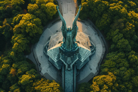 A photo capturing a statue situated on the exterior of a building, showcasing its architectural features, An aerial view of a monumental statue, AI Generated