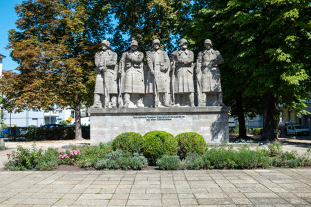 Worms, Germany - August 21, 2023: Stone war memorial depicting five soldiers dedicated to Infantry Regiment 'Prince Carl' No.118 in city of Worms in Germany