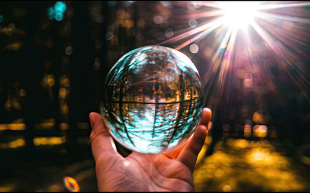 An artistic photograph that adds a fresh perspective to travel blogs, lifestyle articles, or creative visual projects | This image offers an immersive experience, where the warm hues of a sunset are encapsulated in a small glass sphere held between fingers. The inverted reflection within the sphere reveals a serene beach scene, with silhouettes of people gathered to witness the day's end. Skies painted with orange, pink, and blue gradients provide a dramatic backdrop to this tranquil moment. The defocused crowd in the background creates a sense of community and collective appreciation for nature's spectacle. The hand's gesture is gentle, giving the impression that the moment is as delicate as the glass bauble holding it. Precision and intricacy are evident in the way the sphere's surface reflects and intensifies the sunset's beauty, transforming a familiar sight into something magical | This striking visual can enhance travel and tourism marketing materials, or serve as a metaphor in discussions about perspective, reframing life experiences, or finding beauty in small things. The photo could also be utilized in educational content explaining optics or the science of light, resonating well with themes like reflection and refraction | A high-quality image of a sunset seen through a glass orb with soft-focus background that brings a dreamlike quality to the scene, allowing for ample overlay space, suitable for various artistic and editorial applications