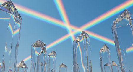 Glass prisms reflecting vibrant rainbow beams on a surface during daylight