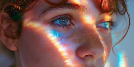 CloseUp of a Freckled Face with Light Reflections Creating a Rainbow Effect on Skin.