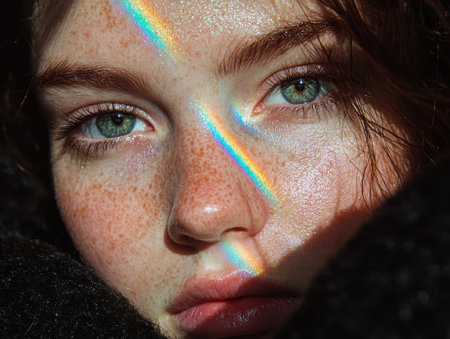 Close-up portrait of a woman with freckles and rainbow light on her face.