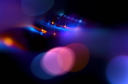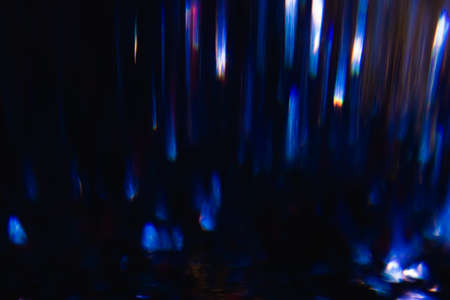 Abstract background of colorful lines in motion on black. Bokeh of defocused splashes, blurred red and blue neon leds, fireworks and salute, space and sky backdrop