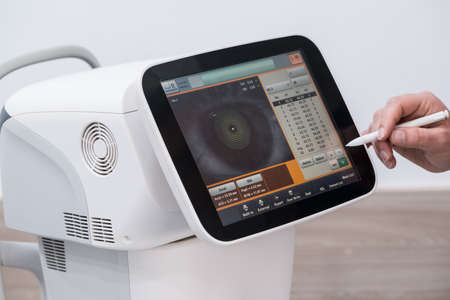 the doctor controls the oculist display with a scanned eye. diagnostic ophthalmologic equipment. medicine concept