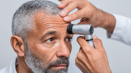 Close-up view of an eye during a medical examination, highlighting the iris and pupil. the image emphasizes the intricate details and features of the eye, showcasing its natural colors and textures under clinical lighting.