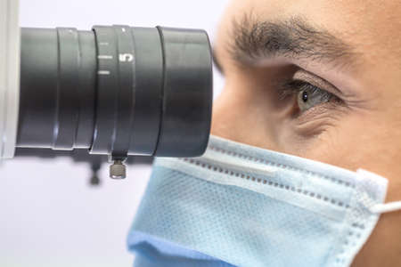 Awesome macro photo of a doctor who looks into the dental microscope on the light background. He wears a blue medical mask. Horizontal.
