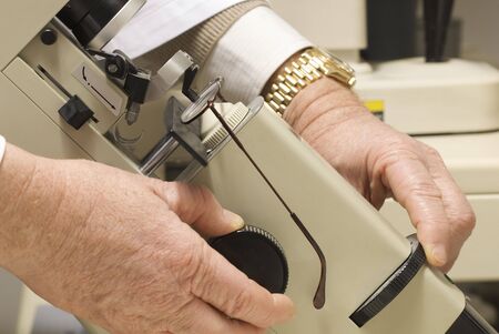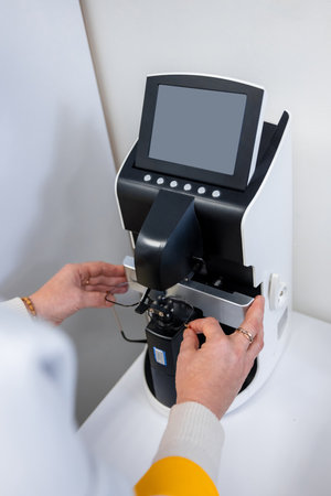 Close up of hands adjusting ophthalmology equipment for precise eye examination in a clinic