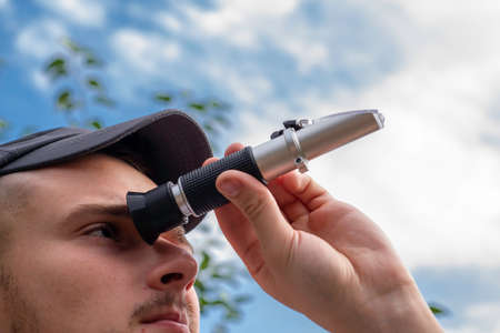 the winemaker looks at the refractometer to determine the sugar content of grape juice. High quality photo