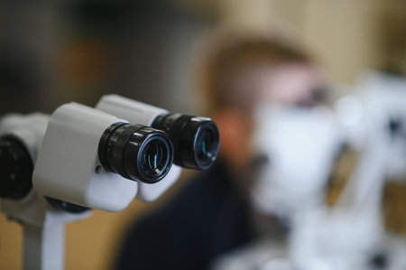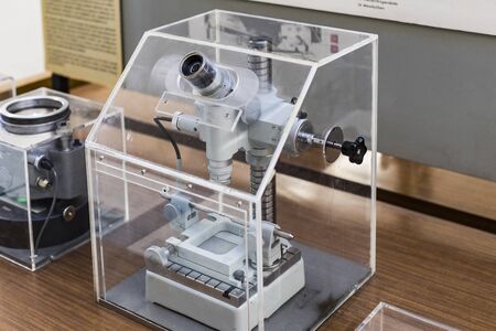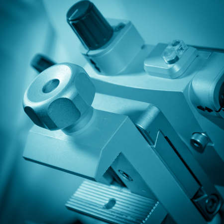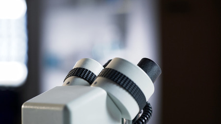 Focus on microscope with metal lens for experiments, educational demonstrations in clinical laboratories. Medicine researching concept. Blurred background