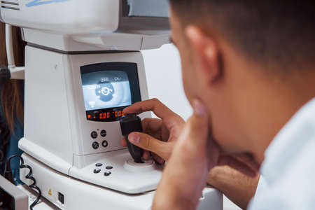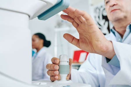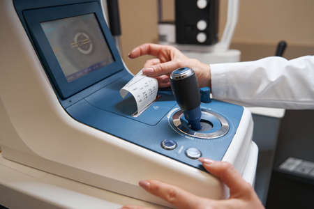 Close-up image of ophthalmologist using modern equipment when checking eyesight of patient