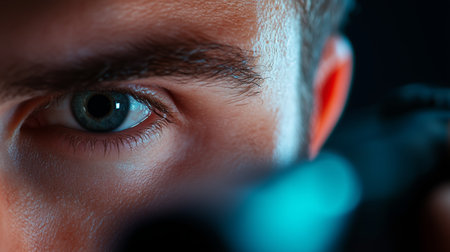 A close-up of a mans blue eye with a focused expression, shot in a dimly lit room