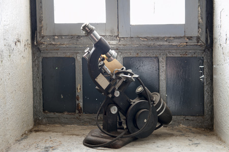An outdated microscope sits on the window sill in a medical cell of an abandoned prison penitentiary.