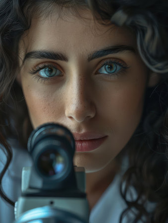 Close Up Portrait Of Female Ophthalmologist In Hospital Looking Through Ophthalmoscope