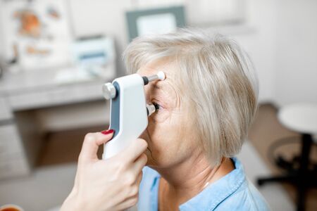 Doctor measuring the eye pressure with modern tonometer to a senior patient in the medical office, close-up