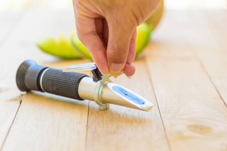 the winemaker applies a drop of grape juice with a pipette to the prism of a refractometer to determine the amount of sugar in the grape juice. High quality photo