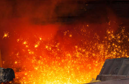 Steel production in electric furnaces. Sparks of molten steel. Electric arc furnace shop EAF. Metallurgical production, heavy industry, engineering, steelmaking