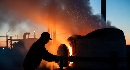 Silhouette of a worker in a cap tending to a hot, glowing industrial furnace or kiln at dusk. Bright orange light, smoke, and sparks erupt from the furnace, highlighting the intense heat and manual labor. This represents industry, manufacturing, or traditional crafts.