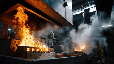 An explosive surge of orange flames erupts from an industrial furnace, enveloped in thick smoke, showcasing a dramatic display of heat and energy in a manufacturing environment.
