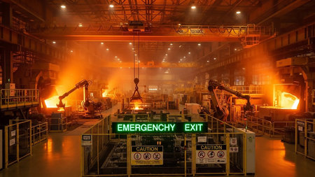 The interior of a brightly lit industrial factory is shown, dominated by the intense orange glow of molten metal being processed in furnaces. Robotic arms are visible, actively engaged in the manufacturing process. An illuminated green EMERGENCY EXIT sign stands out, along with CAUTION signs, highlighting the operational and safety aspects of this heavy industry environment.