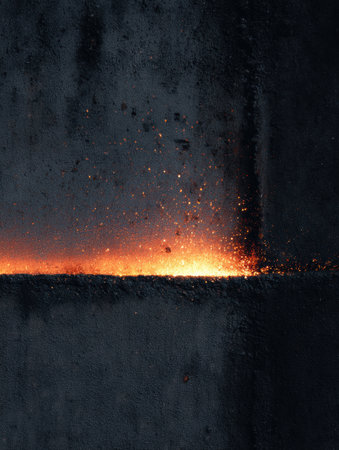 Bright sparks fly from the heated metal surface creating a dramatic effect in a dark industrial setting during a nighttime operation.