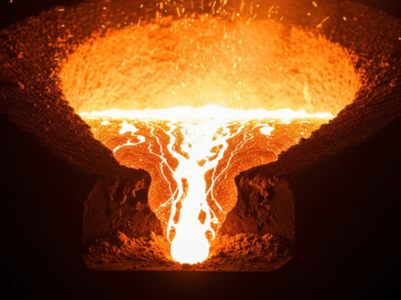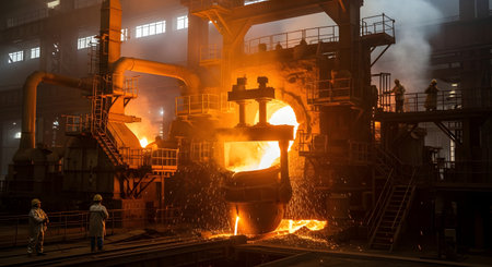 This dynamic image captures the intensity of steel production in an industrial forge, highlighting fiery molten metal and heavy machinery in action.