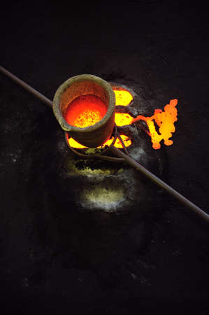 foundry production. A ladle with molten metal. Pouring hot liquid metal into special molds. close-up