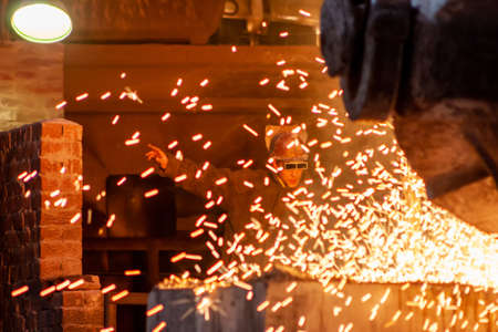 The work of the foundry. Pouring hot metal from the bucket into molds. Bright red metal, smoke and sparks flying to the sides