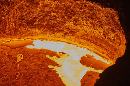 liquid molten steel in a bright red tank, similar to lava in a workshop in a metallurgical plant, ready to be poured into molds, close-up, top view