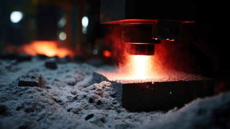 A side view of a laser sintering process in action capturing the moment the focused beam is melting metal powder into a robust component creating a dynamic contrast between solid an
