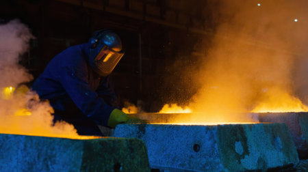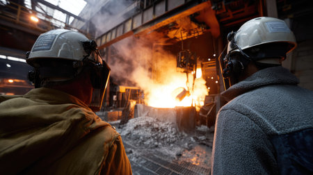 Two workers in safety headgear observe the pouring of molten metal in an industrial foundry, highlighting the dynamic interplay of heat and craftsmanship.