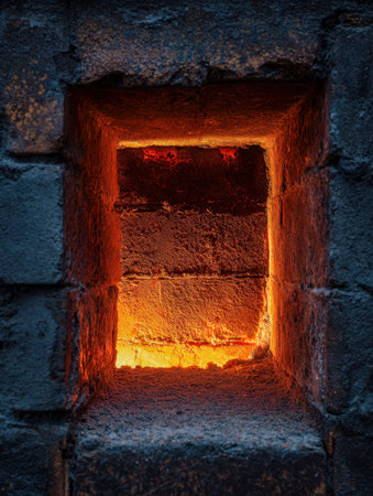 A vibrant burst of orange molten metal spills from a high-temperature industrial furnace, illuminating a rugged brick chamber with intense, flickering light.
