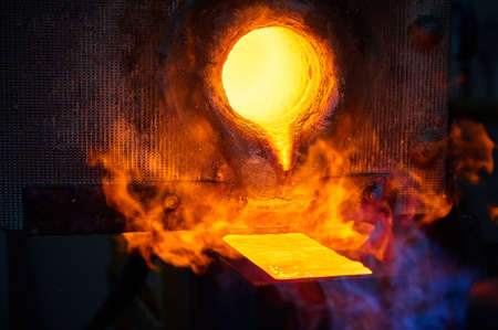 Close-up picture of a professional smelting gold machine in process. A bright red melting steel in little shaping forms on a blurred dark background. Metallurgical production of steel, bronze, metal.