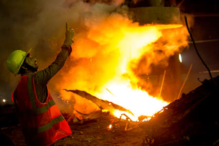 This captivating image captures industrial workers navigating through a fiery environment at night, showcasing the raw intensity of manufacturing.