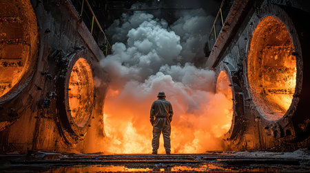A factory worker stands in front of large openings, engulfed by billowing smoke and flames. The scene showcases industrial intensity, highlighting the dangers and energy of metal production.