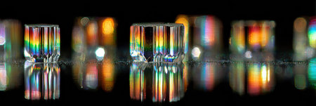 abstract background with rainbow-colored light refractions and glowing prism effects on dark backdrop.