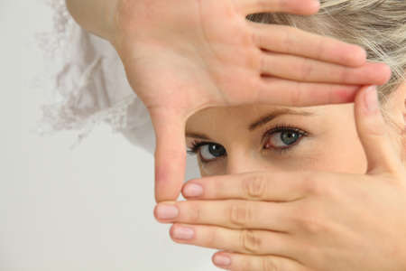 young happy woman showing framing hand gesture isolated on a white background