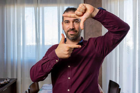 Handsome bearded man in purple shirt framing his face with his hands. Gesturing concept