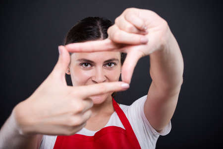 Closeup of young hypermarket seller making hand frame and looking at you on dark background