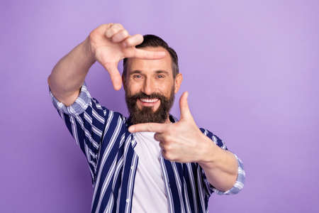 Photo of positive mature hold fingers imagine photographing face isolated over violet color background