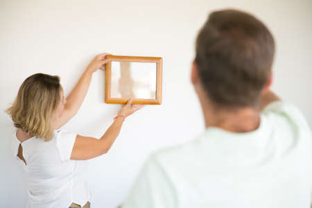 Blonde woman holding and putting picture frame on wall. Unrecognizable man helping her with aligning. Caucasian couple decorating room together. Family, relocation and moving day concept