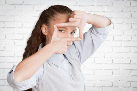 Beautiful young girl in casual clothes is making hand frame, looking at camera and smiling, isolated on white