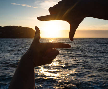 Close up of a mans hands making a frame gesture to capture the beautiful golden sunset. Concept of vision, creativity, planning, and future goals.
