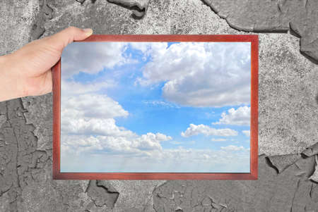 bright sky in a window frame with old wall background